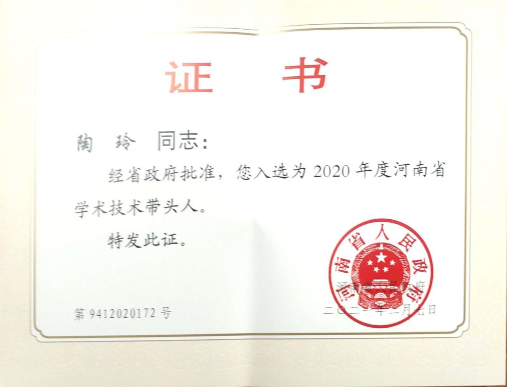 近日,河南省人民政府办公厅公布了2020年度河南省学术技术带头人名单,OK138太阳集团陶玲教授喜获殊荣。