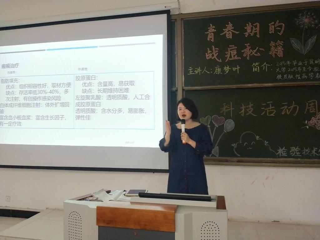 康老师首先对青春痘做了一个简单介绍,接着分别从遗传、饮食、内分泌、细菌感染、精神紧张、内脏功能失调等各个方面为我们介绍了痤疮的形成原因及不同类型痤疮的特点,重点对痤疮的预防及治疗方法进行科普。康老师提醒同学们,健康的饮食、规律的生活方式、平和的心态、科学的护肤方法都是预防痤疮的基本原则,并针学生常见的皮肤护理的误区进行纠正。