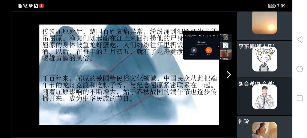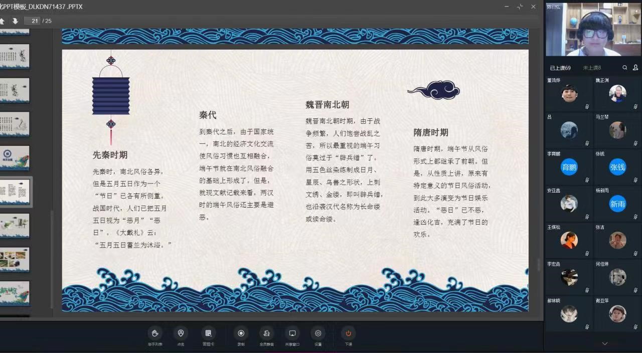本次活动采用网络在线形式举行,各班团支部积极探讨端午节的传统文化,重点了解了农历五月初五挂香囊、吃粽子、赛龙舟等民间风俗习惯,增强了传统民族文化的了解。通过讲解伟大诗人屈原的生平故事,增强了团员们的爱国主义情怀和民族责任感。
