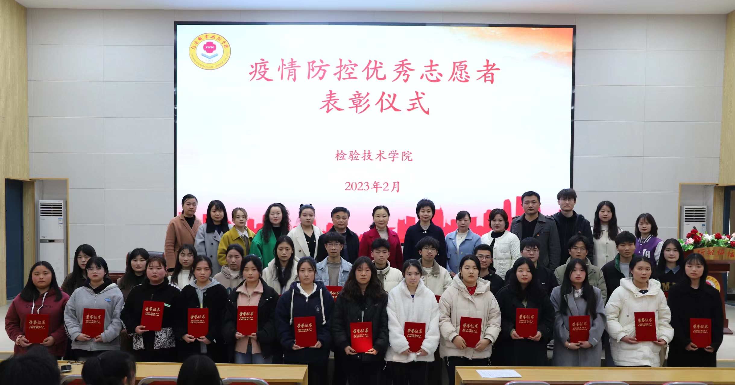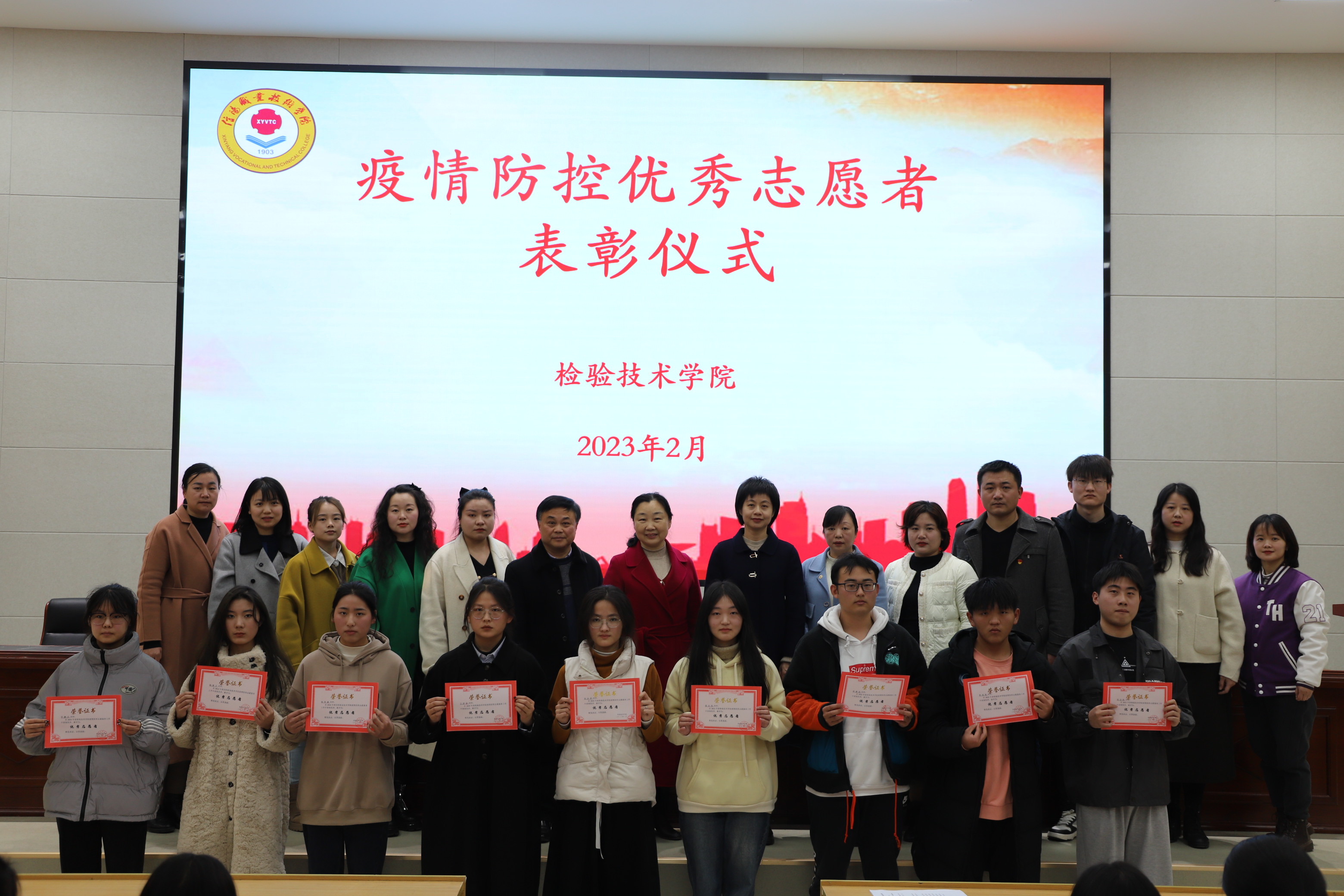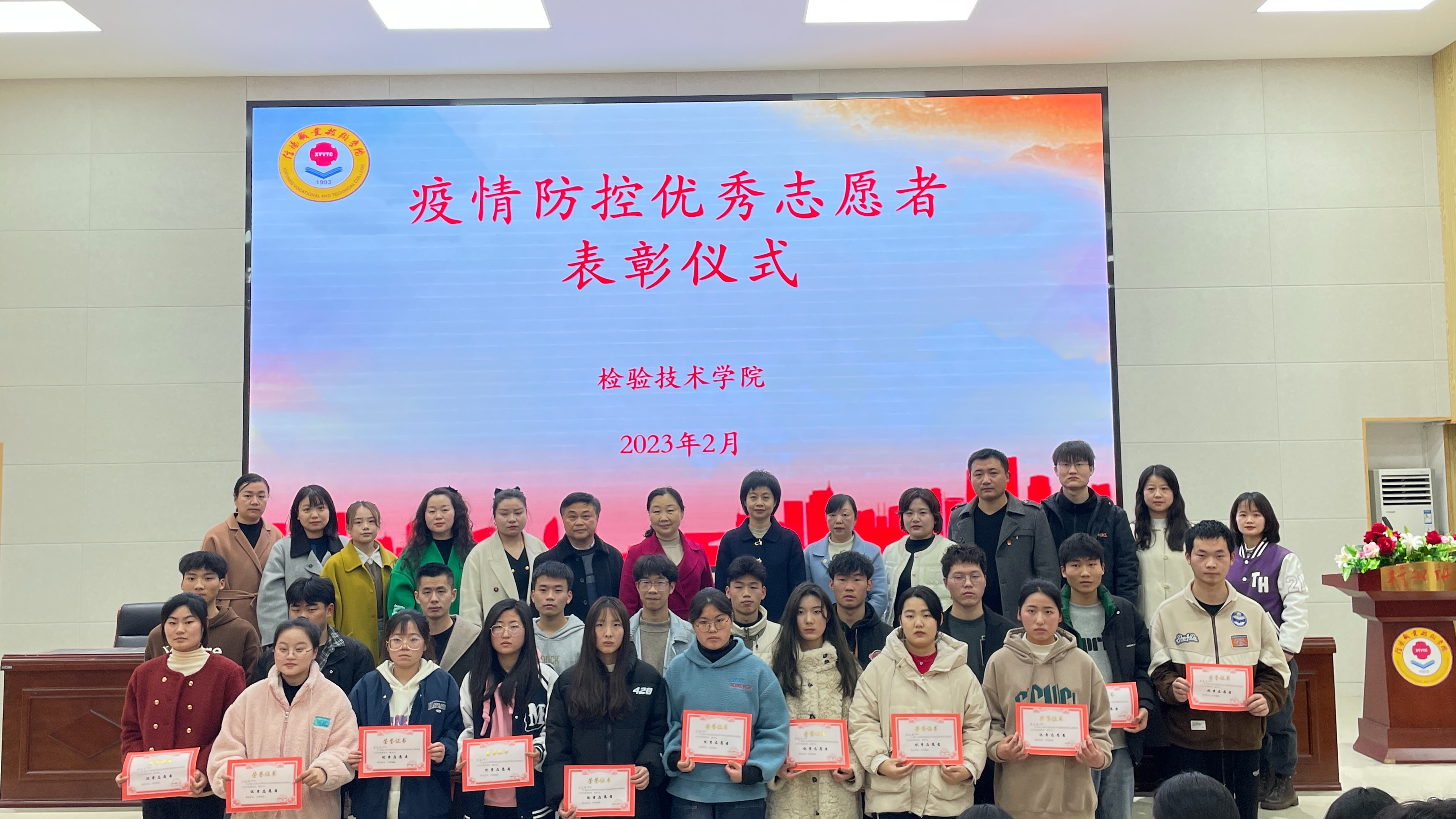 仪式在热烈的掌声中落下帷幕,领导和老师依次同疫情防控优秀志愿者们合影留念。